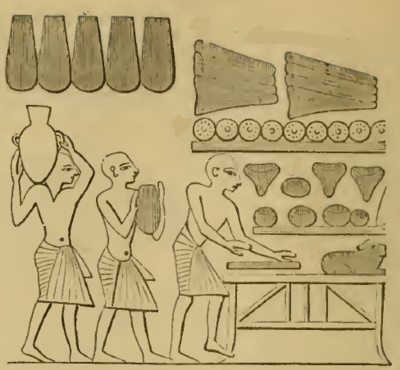 El proceso de elaboración del pan era el siguiente: la harina primero se mezclaba con agua, o tal vez con leche (Burckhardt, Notes on the Bedouins, i. 58); entonces era amasado con las manos (en Egipto con los pies también; Heródoto, ii. 36; Wilkinson, ii. 386) en un pequeño cuenco de madera o 'artesa para amasar', (5 Benditas serán tu canasta y tu artesa. 17 Malditas serán tu canasta y tu artesa. […]Deuteronomio 28:5,17); la expresión en Tomó, pues, el pueblo la masa, antes que fuera leudada, en sus artesas de amasar envueltas en paños, y se las llevaron sobre sus hombros.[…]Éxodo 12:34, 'envueltas en sus sábanas', favorece la idea de un cuenco de madera, hasta que se convertía en masa (34 Tomó, pues, el pueblo la masa, antes que fuera leudada, en sus artesas de amasar envueltas en paños, y se las llevaron sobre sus hombros. 39 Y de la masa que habían sacado de Egipto, cocieron tortas de pan sin levadura, pues no se había leudado, y[…]Éxodo 12:34,39; Fue, pues, Tamar a la casa de su hermano Amnón, y él estaba acostado. Y ella tomó masa, la amasó, hizo tortas delante de él y las coció.[…]2 Samuel 13:8; Los hijos recogen la leña, los padres encienden el fuego, las mujeres preparan la masa para hacer tortas a la reina del cielo, y derraman libaciones a otros dioses para ofenderme.[…]Jeremías 7:18; Todos ellos son adúlteros; son como horno encendido por el hornero, que deja de atizar el fuego desde que prepara la masa hasta que fermenta.[…]Oseas 7:4). Cuando el amasado estaba completo, se añadía generalmente la levadura; pero cuando el tiempo de la preparación era corto, se omitía, y sin levadura se comían las tortas cocidas a toda prisa, como sigue siendo la costumbre entre los beduinos (Entonces Abraham fue de prisa a la tienda donde estaba Sara, y dijo: Apresúrate a preparar tres medidas de flor de harina, amása la y haz tortas de pan.[…]Génesis 18:6; 19:3; Y de la masa que habían sacado de Egipto, cocieron tortas de pan sin levadura, pues no se había leudado, ya que al ser echados de Egipto, no pudieron demorarse ni preparar alimentos para sí mismos.[…]Éxodo 12:39; Y Gedeón entró y preparó un cabrito y pan sin levadura de un efa de harina; puso la carne en una cesta y el caldo en un caldero, y se los llevó a él debajo de la encina y se los presentó.[…]Jueces 6:19; La mujer tenía en casa un ternero engordado y se apresuró a matarlo; y tomando harina, la amasó y coció de ella pan sin levadura.[…]1 Samuel 28:24). Estas tortas se denominaron מַטּוֹת, una palabra de sentido dudoso, que diversamente transmite las ideas de delgadez (Fürst, Lex. s. v.), dulzura (Gesenius, Thesaur. p. 815), o pureza (Knobel, Comm. in "No comeréis nada leudado; en todo lugar donde habitéis comeréis panes sin levadura."[…]Éxodo 12:20), mientras que el pan leudado se llamaba הָמֵץ (lit. afilado o agrio; Y de la masa que habían sacado de Egipto, cocieron tortas de pan sin levadura, pues no se había leudado, ya que al ser echados de Egipto, no pudieron demorarse ni preparar alimentos para sí mismos.[…]Éxodo 12:39; Todos ellos son adúlteros; son como horno encendido por el hornero, que deja de atizar el fuego desde que prepara la masa hasta que fermenta.[…]Oseas 7:4). Tortas sin levadura debían comerse en la Pascua para conmemorar la precipitación de la partida ("Siete días comeréis panes sin levadura; además, desde el primer día quitaréis toda levadura de vuestras casas; porque cualquiera que coma algo leudado desde el primer día hasta el séptimo, esa persona será cortada de Israel.[…]Éxodo 12:15; 13:3,7; No comerás con ella pan con levadura; siete días comerás con ella pan sin levadura, pan de aflicción (porque aprisa saliste de la tierra de Egipto), para que recuerdes todos los días de tu vida el día que saliste de la tierra de Egipto.[…]Deuteronomio 16:3), así como en otras ocasiones sagradas ("Ninguna ofrenda de cereal que ofrezcáis al SEÑOR será hecha con levadura, porque no quemaréis ninguna levadura ni ninguna miel como ofrenda encendida para el SEÑOR.[…]Levítico 2:11; 6:16; y una cesta de tortas sin levadura de flor de harina mezcladas con aceite, y hojaldres sin levadura untados con aceite, junto con sus ofrendas de cereal y sus libaciones.[…]Números 6:15). La masa leudada se dejaba reposar durante algún tiempo (Les dijo otra parábola: El reino de los cielos es semejante a la levadura que una mujer tomó y escondió en tres medidas de harina hasta que todo quedó fermentado.[…]Mateo 13:33; Es semejante a la levadura que una mujer tomó y escondió en tres medidas de harina hasta que todo quedó fermentado.[…]Lucas 13:21), a veces toda la noche ('toda la noche duerme su hornero', pues sus corazones son como un horno mientras se acercan a su emboscada; toda la noche duerme su ira, por la mañana arde como llamas de fuego.[…]Oseas 7:6), expuesta a un calor moderado para adelantar la fermentación ('cesa de avivar') el fuego 'hasta que se haya leudado', Todos ellos son adúlteros; son como horno encendido por el hornero, que deja de atizar el fuego desde que prepara la masa hasta que fermenta.[…]Oseas 7:4).