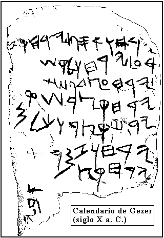 La tablilla de piedra hallada en Gezer muestra un calendario con el ciclo agrícola de las estaciones. En siete líneas, sobre un trozo de caliza blanca de 7 por 10 centímetros, enumera los meses y las estaciones del modo siguiente: