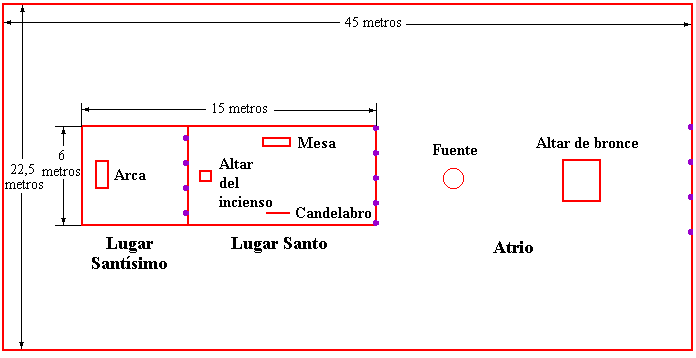 Las partes del tabernáculo (25 1 Y habló el SEÑOR a Moisés diciendo: 2 Di a los hijos de Israel que tomen una ofrenda para mí; de todo aquel cuyo corazón le mueva a hacerlo, tomaréis mi ofrenda. 3 Y esta es la ofrenda que tomaréis de ellos: oro, plata y bronce; 4 tela azul, púr[…]Éxodo 25:1-27:21; 30:1-10,17-38). El tabernáculo estaba compuesto de dos partes principales: El atrio y la morada. En el atrio (9 Harás también el atrio del tabernáculo. Al lado sur habrá cortinas de lino fino torcido para el atrio, de cien codos de largo por un lado. 10 Sus columnas serán veinte, con sus veinte basas de bronce; los ganchos de las columnas y sus molduras será[…]Éxodo 27:9-19) estaba el altar de los sacrificios (1 Harás también el altar de madera de acacia, de cinco codos su longitud, de cinco codos su anchura, el altar será cuadrado, y de tres codos su altura. 2 Y le harás cuernos en sus cuatro esquinas; los cuernos serán de una misma pieza con el altar, y […]Éxodo 27:1-8) y la fuente de bronce. La morada (1 Harás el tabernáculo con diez cortinas de lino fino torcido, y tela azul, púrpura y escarlata; las harás con querubines, obra de hábil artífice. 2 La longitud de cada cortina será de veintiocho codos, y la anchura de cada cortina de cuatro codos; t[…]Éxodo 26:1-37) estaba dividida en dos partes: Lugar santo y lugar santísimo. En el primero estaba la mesa de los panes de la proposición (23 Harás asimismo una mesa de madera de acacia; su longitud será de dos codos, su anchura de un codo y su altura de un codo y medio. 24 Y la revestirás de oro puro y harás una moldura de oro a su alrededor. 25 Le harás también alrededor un borde de u[…]Éxodo 25:23-30), el candelabro (31 Harás además un candelabro de oro puro. El candelabro, su base y su caña han de hacerse labrados a martillo; sus copas, sus cálices y sus flores serán de una pieza con él. 32 Y saldrán de sus lados seis brazos; tres brazos del candelabro de uno de[…]Éxodo 25:31-39) y el altar del incienso (1 Harás también un altar para quemar en él incienso; de madera de acacia lo harás. 2 De un codo será su longitud y de un codo su anchura, será cuadrado; y de dos codos su altura. Sus cuernos serán de una pieza con él. 3 Lo revestirás de oro puro: su […]Éxodo 30:1-10). En el segundo estaba el arca del pacto (10 Harán también un arca de madera de acacia; su longitud será de dos codos y medio, su anchura de un codo y medio, y su altura de un codo y medio. 11 Y la revestirás de oro puro; por dentro y por fuera la revestirás, y harás una moldura de oro alred[…]Éxodo 25:10-22).